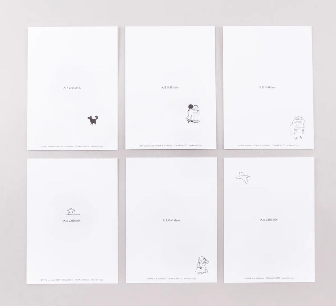 M.B.ゴフスタインの名シーンを集めて、特別なポストカードセットを作りました。「ブルッキーのひつじ」や「ほんとうの私たち」など、数々の絵本の中から6作品分の名場面が12枚のポストカードになっています。お気に入りの作品はもちろん、初めて出会う新しい作品との出会いがあるかもしれません。定形外のサイズなので、郵便で送る際は84円切手を貼ってくださいね。